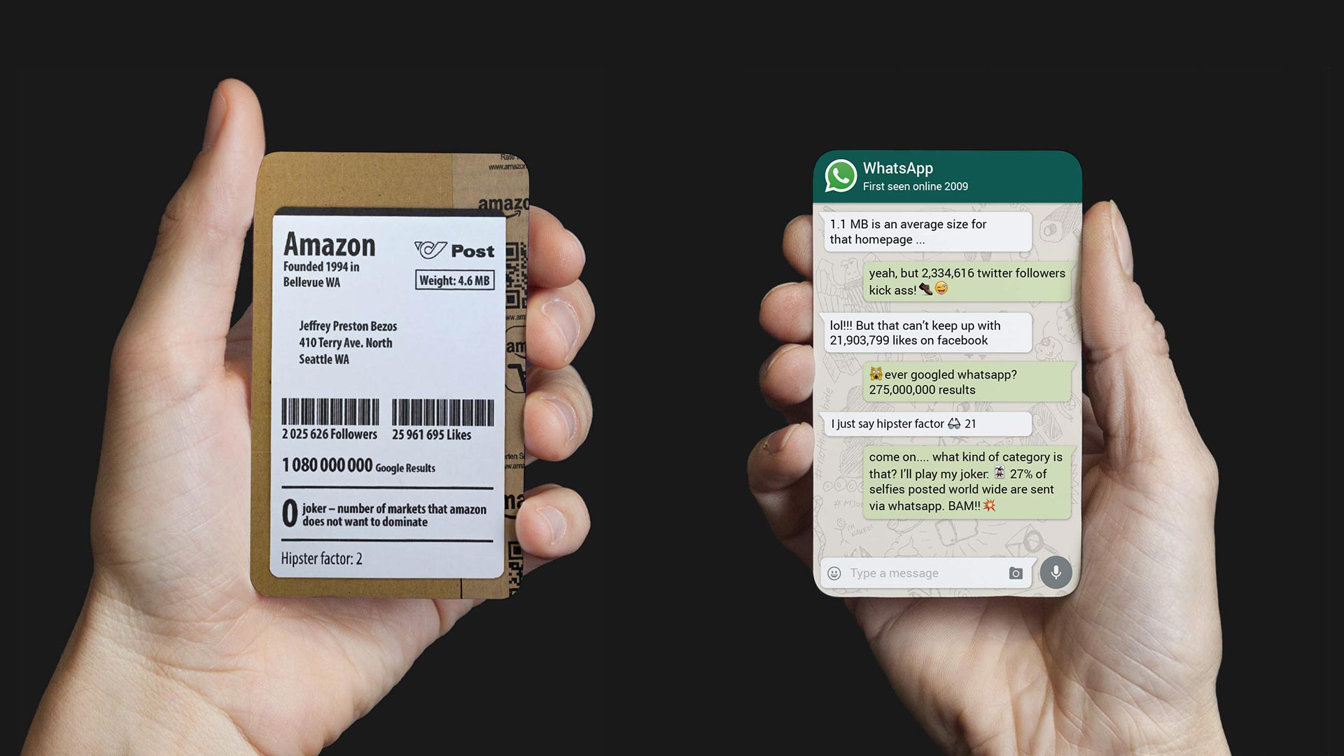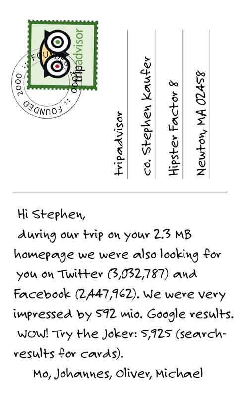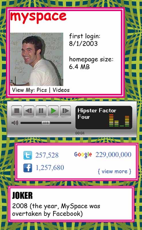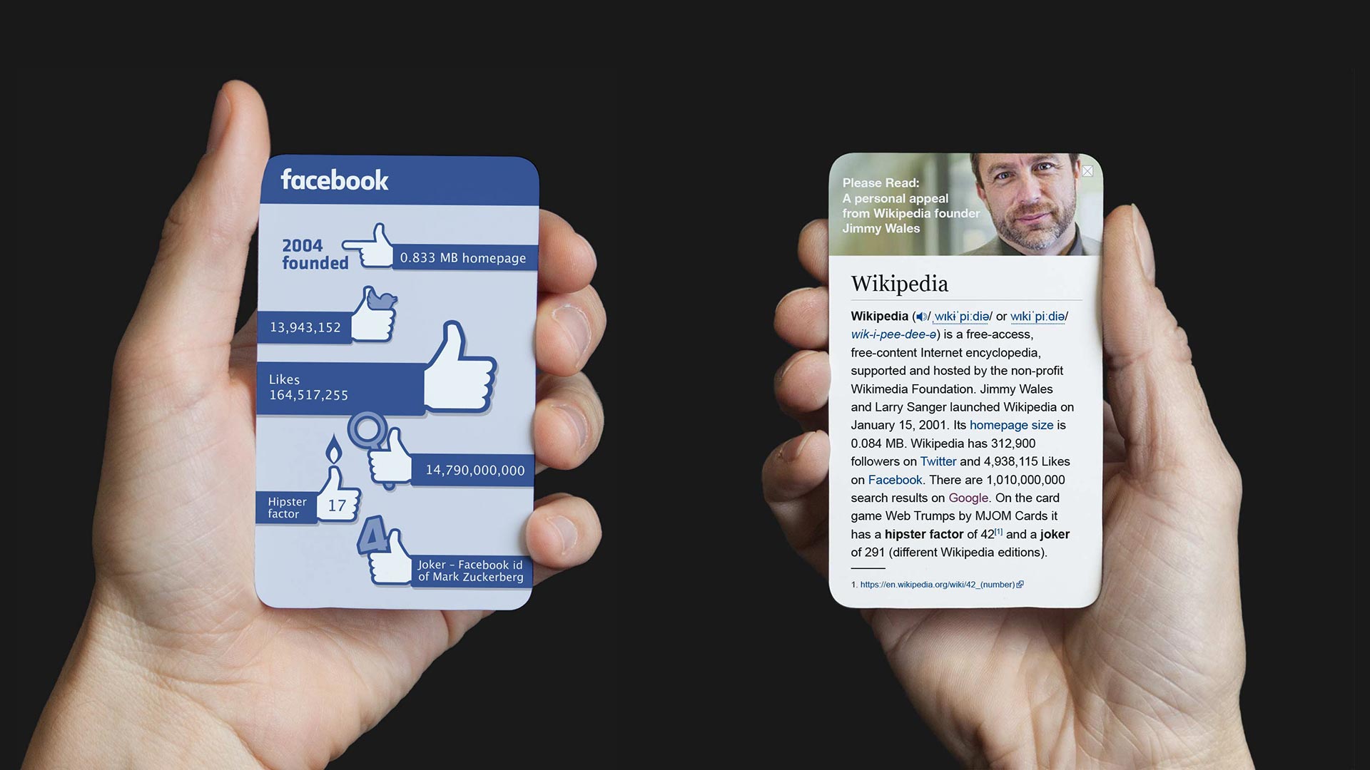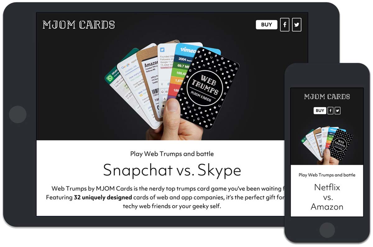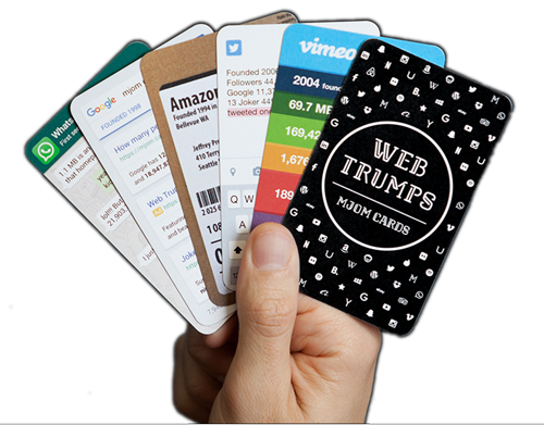 MJOM Cards sind ein Must-Have für Design-Geeks und Internet-Nerds. Ein cooles und liebevoll gestaltetes Kartenspiel bei dem die 32 beliebtesten Web- und App- Giganten wie Google, Twitter, Facebook, YouTube, Soundcloud, Uber oder Youporn gegeneinander antreten. Als Spass-Projekt in 3 Monaten entwickelt, online in 21 Länder verkauft, fast den Preis fürs beste Nerd-Game des Jahres gewonnen und…, leider ausverkauft!